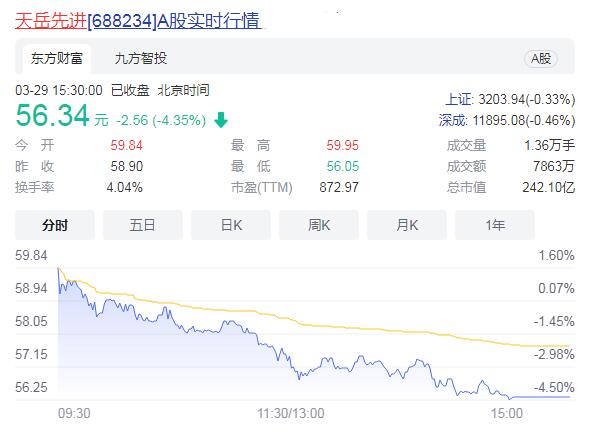 天岳先進(jìn)(688234.SH)今日股價(jià)下跌,截至收盤(pán),該股報(bào)56.34元,跌幅4.35%,總市值242.10億元。