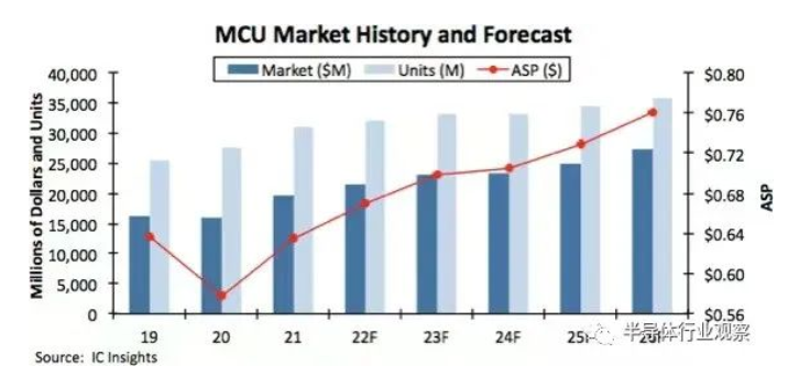 2021 年,微控制器平均售價(jià)的強(qiáng)勁反彈使 其ASP 上漲 10% 至 0.64 美元,這是 2019 年 Covid-19 大流行之前的平均價(jià)格。2021 年 ,MCU的ASP 增長是 過去25年MCU 的最高年增長率。這主要是由于 2021 年經(jīng)濟(jì)反彈中微控制器供應(yīng)緊張所致。二十年來,MCU 市場一直面臨價(jià)格大幅下滑,但過去五年 ASP 下降速度放緩。IC Insights 現(xiàn)在預(yù)計(jì) ,MCU 的 ASP 將在 2021 年至 2026 年間以 3.5% 的復(fù)合年增長率 (CAGR) 上升。