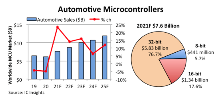 ICInsights:2021年汽車微控制器銷售額將增長23%
