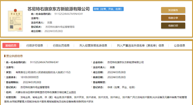 天眼查顯示,蘇尼特右旗京東方新能源有限公司注冊資本1.81億元,公司由北京亦莊京東方新能源有限公司100%持股,公司董事長為吳磊。
