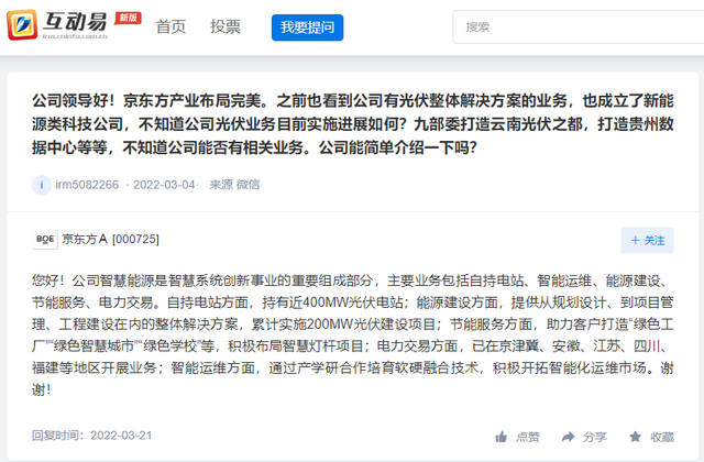 就在近日,在深交所互動易回應(yīng)投資者時表示,京東方表示,公司智慧能源是智慧系統(tǒng)創(chuàng)新事業(yè)的重要組成部分,主要業(yè)務(wù)包括自持電站、智能運(yùn)維、能源建設(shè)、節(jié)能服務(wù)、電力交易。自持電站方面,持有近400MW光伏電站;能源建設(shè)方面,提供從規(guī)劃設(shè)計、到項目管理、工程建設(shè)在內(nèi)的整體解決方案,累計實施200MW光伏建設(shè)項目;節(jié)能服務(wù)方面,助力客戶打造“綠色工廠”“綠色智慧城市”“綠色學(xué)校”等,積極布局智慧燈桿項目;電力交易方面,已在京津冀、安徽、江蘇、四川、福建等地區(qū)開展業(yè)務(wù);智能運(yùn)維方面,通過產(chǎn)學(xué)研合作培育軟硬融合技術(shù),積極開拓智能化運(yùn)維市場。