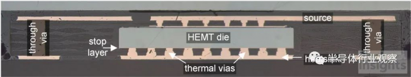 其他制造商已開始關(guān)注 GaN 特定封裝解決方案。例如,GaN Systems 有幾個封裝,其中嵌入了芯片。如下圖中的 GS61008P 橫截面圖。銅柱通過封裝通孔直接連接到管芯的頂部和底部,然后將它們連接到散熱器。
