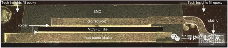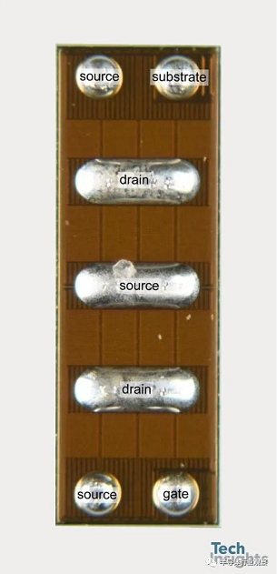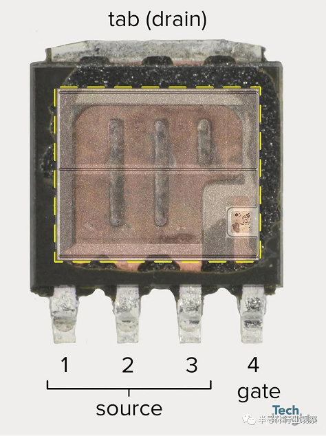 下圖顯示了該設(shè)備的平面圖,它已被噴射蝕刻以暴露銅夾。這直接焊接到芯片的源極觸點。