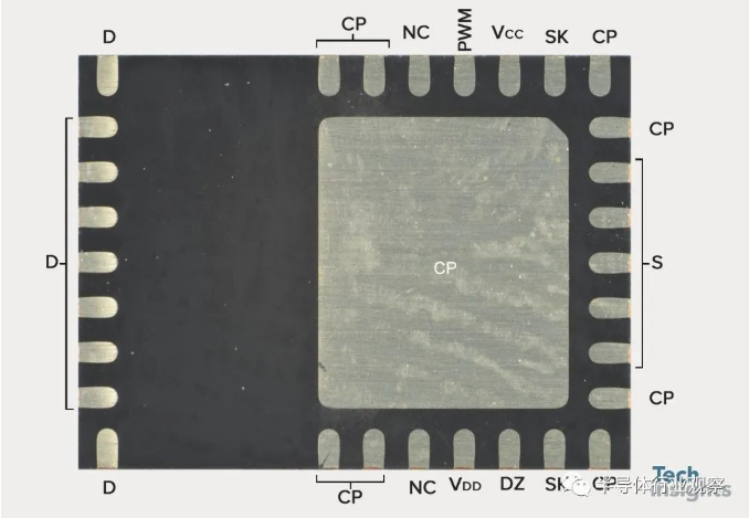 例如,參見 Navitas NV6128,這是一款單片集成 GaN IC,適合 QFN 封裝的多個輸出端口。如下圖所示,可以看到帶有端口注釋的封裝底部。GaN die位于冷卻墊“CP”頂部的一側(cè)。這對于這個設(shè)備來說顯然已經(jīng)足夠了;盡管有趣的是,對于Navitas 最近宣布的帶有“GaN Sense”的第三代 GaN,他們將重點放在了用于檢測和控制工作溫度的控制電路上。