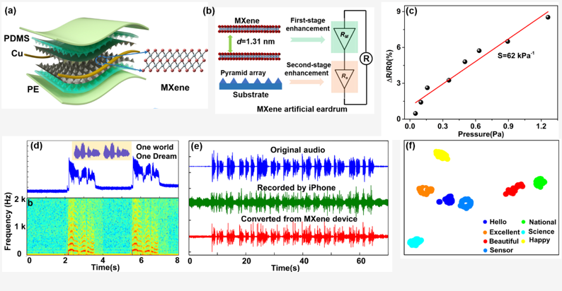 清華大學(xué)集成電路學(xué)院任天令教授團(tuán)隊(duì)報(bào)道了一種基于微結(jié)構(gòu)襯底的MXene聲學(xué)傳感器,用于模仿人耳膜的功能來實(shí)現(xiàn)聲音的探測(cè)與識(shí)別。MXene作為一種新型的二維(2D)過渡金屬碳化物和氮化物材料,具有優(yōu)異的物理和化學(xué)特性,已經(jīng)被廣泛應(yīng)用于傳感器領(lǐng)域。Ti3C2Tx作為MXene家族的代表,其較大的層間距和特殊二維層狀結(jié)構(gòu)使Ti3C2Tx具有高的力學(xué)敏感性。微金字塔陣列結(jié)構(gòu)的PDMS襯底具有極低的形變因子,在外力下容易發(fā)生形變。因此,采用具有大層間距離的MXene和具有微金字塔結(jié)構(gòu)的PDMS襯底可以實(shí)現(xiàn)聲音信號(hào)的兩級(jí)放大,獲得高的靈敏度(62 kPa-1)和低的探測(cè)下限(0.1 Pa),并且實(shí)現(xiàn)了聲音信號(hào)的記錄功能。通過MXene器件記錄的語音信號(hào)波形與原始音頻波形幾乎保持一致,表明具有出色的聲學(xué)傳感能力。同時(shí),采用機(jī)器學(xué)習(xí)算法實(shí)現(xiàn)了280個(gè)語音信號(hào)的識(shí)別與分類,訓(xùn)練集和測(cè)試集的準(zhǔn)確率可以分別達(dá)到96.4%和95%。以上的研究表明柔性MXene聲學(xué)傳感器在人機(jī)交互系統(tǒng)中具有重要的應(yīng)用潛力。