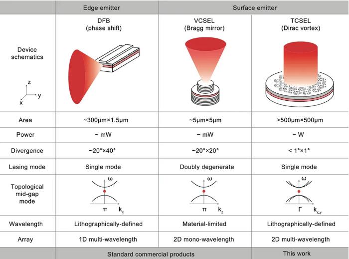 之前,中國科學(xué)院物理研究所/北京凝聚態(tài)物理國家研究中心光物理重點(diǎn)實(shí)驗(yàn)室L01組陸凌團(tuán)隊(duì),提出了一種“狄拉克渦旋”拓?fù)涔馇唬且阎竺娣e單模性最好的光腔設(shè)計(jì),可以從原理上突破現(xiàn)有瓶頸,同時(shí)提高出射功率和光束質(zhì)量。最近,他們將原創(chuàng)的拓?fù)涔馇粦?yīng)用于面發(fā)射半導(dǎo)體激光器中,研制出了拓?fù)淝幻姘l(fā)射激光器(topological-cavity surface-emitting laser: TCSEL), 得到了遠(yuǎn)超同類商用產(chǎn)品的指標(biāo)和性能(見圖一中的比較)。在1550nm這一最重要的通信和人眼安全波段,同時(shí)實(shí)現(xiàn)了單個(gè)器件10W峰值功率、小于1°的遠(yuǎn)場發(fā)散角、60dB邊模抑制比,和二維多波長陣列的集成能力。