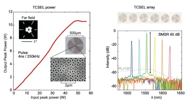 圖2. TCSEL性能:左側(cè)圖為激光器輸入輸出的功率,插圖為激光器的遠(yuǎn)場照片、顯微鏡圖、掃描電子顯微鏡圖;右側(cè)圖為多波長陣列特性。