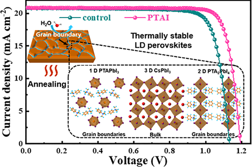 圖1. 基于PTAI低維鈣鈦礦鈍化策略所制備的CsPbI3鈣鈦礦電池的J-V特性曲線及低維鈣鈦礦在CsPbI3晶界處分布示意圖。