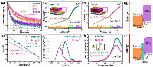 圖2. 太陽能電池性能表征:(a)基于不同有機陽離子所制備CsPbI3薄膜的瞬態(tài)熒光光譜(TRPL);暗態(tài)空間電荷限制電流(SCLC):b)對比組和c)實驗組;基于導(dǎo)納光譜推出(d)阿倫尼烏斯關(guān)系,用于計算缺陷能級和特征轉(zhuǎn)換頻率,(e)缺陷態(tài)密度分布,f)界面缺陷;CsPbI3/spiro-OmetaD界面復(fù)合的示意圖:(g)對比組和(h)實驗組。