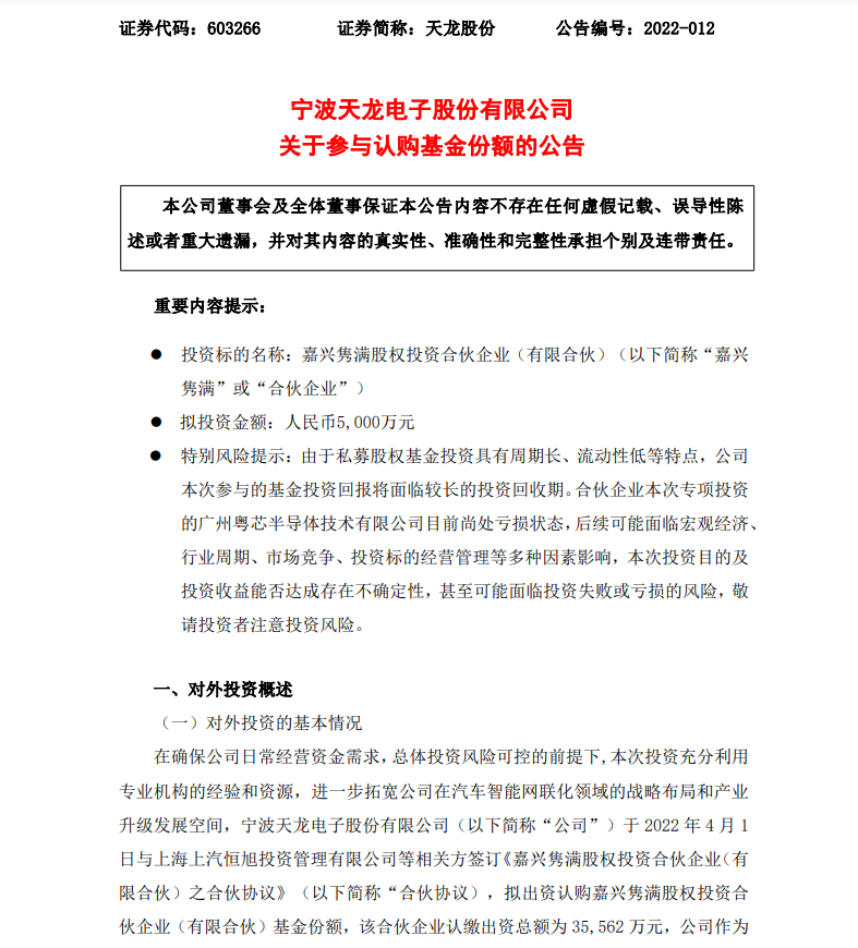寧波天龍電子股份有限公司4月1日晚間公告,公司與上海上汽恒旭投資管理有限公司等相關(guān)方簽訂《合伙協(xié)議》,擬出資認(rèn)購(gòu)嘉興雋滿股權(quán)投資合伙企業(yè)(有限合伙)基金份額,公司作為有限合伙人認(rèn)繳出資5000萬(wàn)元,占認(rèn)繳出資總額的14.06%。合伙企業(yè)擬專項(xiàng)投資于廣州粵芯半導(dǎo)體技術(shù)有限公司。