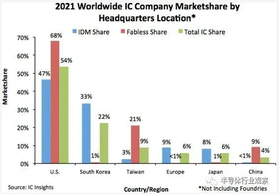 韓國(guó)和日本公司在無晶圓IC領(lǐng)域的占有率極低,中國(guó)而臺(tái)灣和中國(guó)大陸公司在IC市場(chǎng)的IDM部分的份額非常低??傮w而言,總部位于美國(guó)的公司在 IDM、無晶圓廠和 IC 行業(yè)總市場(chǎng)份額方面表現(xiàn)出最平衡。