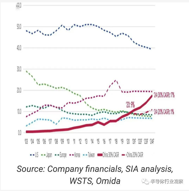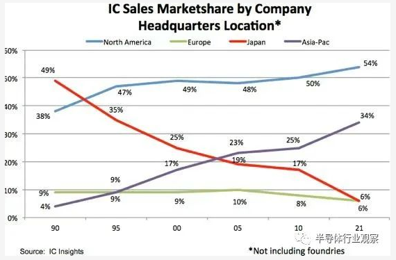 與過去 30 年日本和歐洲公司的 IC 市場(chǎng)份額下滑相比,美國(guó)和亞洲 IC 供應(yīng)商的份額自 1990 年以來一直在攀升。如圖 2 所示,亞洲公司見證了它們?cè)谌?IC 市場(chǎng)中的份額從 1990 年的微不足道的 4% 飆升至 2021 年的 34%。 亞洲 IC 供應(yīng)商的這一份額增長(zhǎng)相當(dāng)于 31 年 IC 銷售復(fù)合年增長(zhǎng)率為 15.9%,幾乎是同期 IC 市場(chǎng)總復(fù)合年增長(zhǎng)率 8.2% 的兩倍.