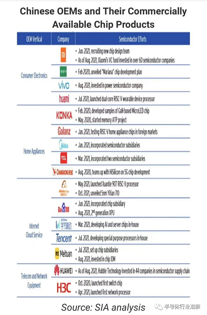 與此同時(shí),中國(guó)消費(fèi)電子和家電OEM以及領(lǐng)先的互聯(lián)網(wǎng)公司也通過內(nèi)部設(shè)計(jì)芯片和投資老牌半導(dǎo)體公司的方式加大了向半導(dǎo)體領(lǐng)域的擴(kuò)張力度,在設(shè)計(jì)先進(jìn)芯片和建設(shè)國(guó)產(chǎn)芯片方面取得了顯著進(jìn)展。