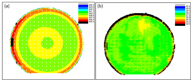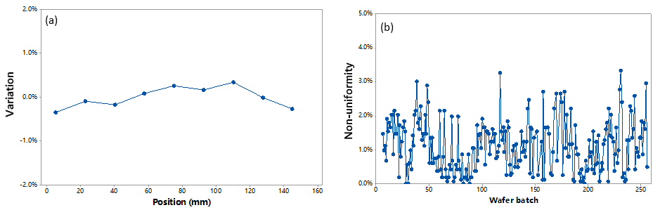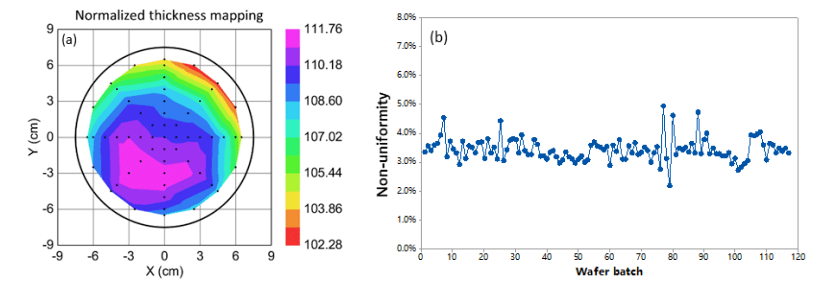 圖8 介質(zhì)膜的特性。(a) 6" 晶圓內(nèi)的氧化硅歸一化厚度。(b) 一定時期內(nèi)氧化硅厚度不均勻性,一個數(shù)據(jù)點代表一個晶圓批次。