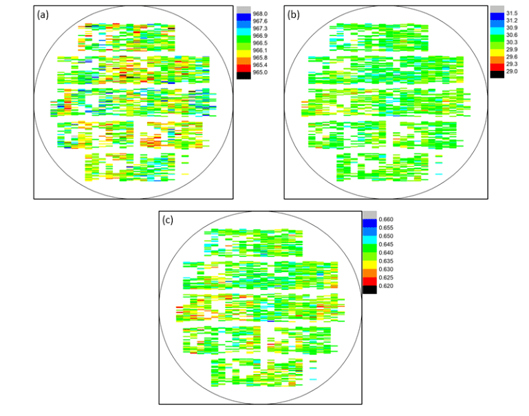 圖13 6" 980nm晶圓的芯片的性能數(shù)據(jù)分布,測試溫度25°C。(a) 波長,(b) 光功率,(c) 電光轉(zhuǎn)換效率。