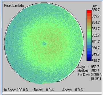 圖3 9xx nm外延晶圓的PL峰值波長分布圖。