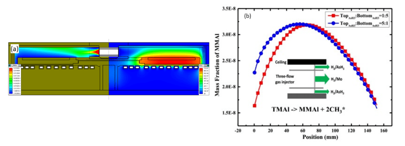 圖1 行星式8x6"MOCVD反應(yīng)器的建模。(a) 反應(yīng)器中的氣體濃度和溫度二維圖像。(b) 在兩種不同的AsH3注入配置下,6"襯底上的MMAl分布的建模結(jié)果示例。