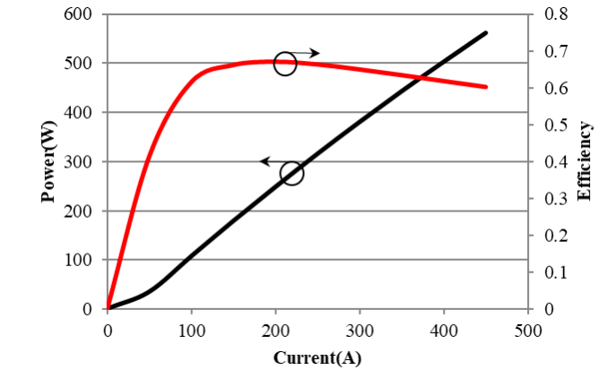 808 nm激光巴條是固體激光泵浦中應(yīng)用最廣泛的產(chǎn)品。批量生產(chǎn)的巴條腔長為1.5mm,填充因子為80%。激光巴條粘合到微通道熱沉(MCC)上,并在準(zhǔn)CW條件下進(jìn)行測試,脈沖寬度為200μs,重復(fù)頻率為400Hz,冷卻水溫度為25°C。光功率和電光轉(zhuǎn)換效率與工作電流的關(guān)系如圖11所示。450A時光功率高于560W,峰值電光轉(zhuǎn)換效率達(dá)到67%。500W工作條件下的電光轉(zhuǎn)換效率在60%以上, 這些器件在TE偏振模式下工作。這個數(shù)據(jù)是目前我們所知最高的。