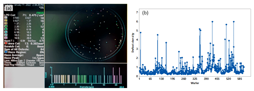 外延層中的缺陷是器件光學(xué)災(zāi)變損傷(COD)失效模式的主要原因。因此,外延缺陷控制在生長過程中非常重要。通過合理的配件維護(hù)和腔室調(diào)節(jié),缺陷得到了很好的控制。圖6(a)顯示了6" 晶圓之間的典型缺陷分布,缺陷的尺寸范圍為0.1至20μm,總?cè)毕菝芏葹?/span>0.475cm -2 。圖6(b)是一定時期內(nèi)生長的650片晶圓的缺陷密度變化趨勢圖。這些晶圓的平均表面缺陷密度為0.77cm-2。表面缺陷密度超過3.0cm-2控制限制的外延晶圓百分比僅為2.1%。