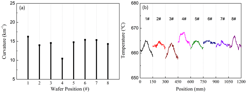 圖2 MOCVD 生長參數(shù)的過程監(jiān)控。(a)同批次生長8片晶圓的曲率。(b)9xx nm外延結(jié)構(gòu)生長過程中晶圓的溫度分布。