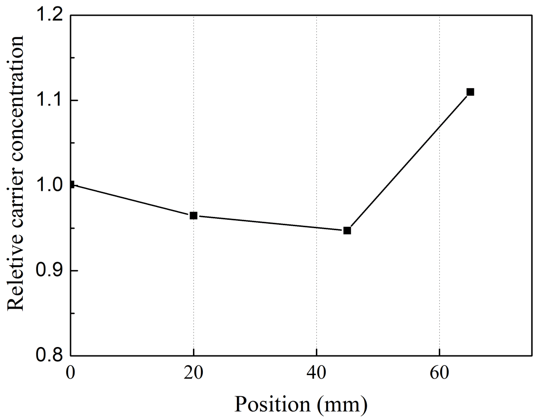 為了實現(xiàn)高工作功率和電光轉(zhuǎn)換效率,我們在外延層結(jié)構(gòu)的摻雜水平、材料組分和厚度方面進(jìn)行了精細(xì)設(shè)計。摻雜分布曲線很重要,特別是對于P面波導(dǎo)和包層。圖5顯示了通過ECV(電化學(xué)電容-電壓)測量的9xx nm晶圓的AlGaAs包層中的相對載流子濃度。我們測量了從晶圓中心到徑向距中心65mm四個位置。載流子濃度由晶圓中心的值歸一化。四個測試點之間的載流子濃度變化僅為15%。