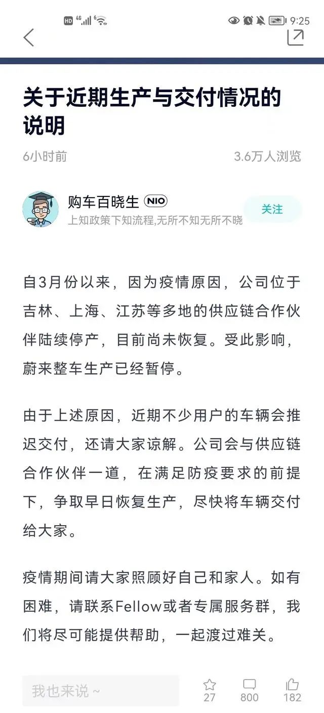 蔚來汽車4月9日在其官方APP發(fā)布“關(guān)于近期生產(chǎn)與交付情況的說明”,稱自3月份以來,因疫情原因,公司位于吉林、上海、江蘇等多地的供應(yīng)鏈合作伙伴陸續(xù)停產(chǎn),目前尚未恢復(fù)。受此影響,蔚來整車生產(chǎn)已經(jīng)暫停。蔚來方面表示會與供應(yīng)鏈合作伙伴一道,在滿足防疫要求的前提下,爭取早日恢復(fù)生產(chǎn),盡快交付。