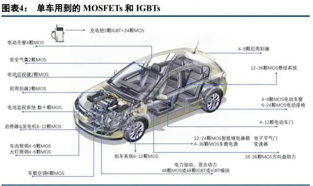 傳統(tǒng)燃油車中僅有少量的 IGBT 單管用于發(fā)動(dòng)機(jī)點(diǎn)火器,純電汽車的動(dòng)力系統(tǒng)轉(zhuǎn)為電池以后,IGBT 模塊成 為電驅(qū)系統(tǒng)中逆變器的標(biāo)配,此外新能源汽車在車載充電機(jī)(OBC)、DC-DC 升壓器、電空調(diào)驅(qū)動(dòng)也需要用到 IGBT 單管。根據(jù)產(chǎn)業(yè)鏈調(diào)研與我們測(cè)算,四驅(qū)版本的純電車型前后雙電機(jī)各需要 18 顆 IGBT,車載充電機(jī)需要 4 顆,電動(dòng)空調(diào) 8顆,合計(jì)一臺(tái)電動(dòng)車需要 48 顆 IGBT 芯片。