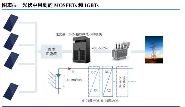 雙碳政策下,以光伏和風(fēng)電為代表的新能源發(fā)電的裝機(jī)量大幅增長(zhǎng),太陽(yáng)能發(fā)電中 DC-DC 直流轉(zhuǎn)換器和 光伏逆變器均需要用到 IGBT 作為功率開關(guān)。其中逆變器的效率很大程度上取決于設(shè)計(jì)使用的元器件,元器件 的性能可以由功率損耗來衡量,功率損耗分為導(dǎo)通損耗和開關(guān)損耗。相較于 MOSFETs 而言,IGBT 適用于較低 開關(guān)頻率和大電流的應(yīng)用,大電流下 IGBT 的導(dǎo)通損耗比 MOSFET 更低,MOSFET 有能力滿足高頻、小電流的應(yīng)用,具有更低的開關(guān)損耗,更適合開關(guān)頻率在 100KHz 以上的逆變器模塊。