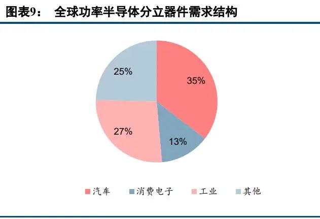 全球功率半導(dǎo)體行業(yè)市場(chǎng)規(guī)模在 2019 年達(dá)到 464 億美元,相較于上一輪高景氣周期的 2018 年同比下滑 3.53%。2020 年和 2021 年在疫情影響全球進(jìn)入“居家辦公模式”,服務(wù)器和 PC 的強(qiáng)勁復(fù)蘇疊加高景氣的電動(dòng)車 和新能源發(fā)電需求刺激,功率半導(dǎo)體行業(yè)迎來拐點(diǎn)。SIA 預(yù)計(jì) 2021 年全球半導(dǎo)體的銷售額將達(dá)到 5530 億美元, 創(chuàng)下新高,同比增長(zhǎng) 25.6%,全球功率半導(dǎo)體龍頭廠商英飛凌 Infineon,恩智浦 NXP,意法半導(dǎo)體 STM,安森 美 ON semi,2021 年前三季度分別成長(zhǎng) 32.5%,31.43%,31.8%和 28.5%,我們預(yù)計(jì)全球功率半導(dǎo)體的行業(yè)增速 預(yù)計(jì)在 2021 年有望達(dá)到 30%,市場(chǎng)規(guī)模將接近 600 億美元。從全球功率半導(dǎo)體分立器件需求結(jié)構(gòu)來看,汽車是 需求最大的領(lǐng)域,占比達(dá)到 35%,其次是工業(yè)和消費(fèi)電子領(lǐng)域,需求占比分別為 27%和 13%。