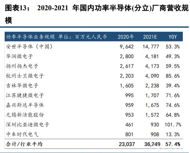 根據(jù) Omdia 的統(tǒng)計(jì),2019年國(guó)內(nèi)功率半導(dǎo)體市場(chǎng)規(guī)模約為 177 億美元,約占全球市場(chǎng)需求的 38%,2020年隨著半導(dǎo)體行業(yè)復(fù)蘇進(jìn)入新一輪高增長(zhǎng)周期。目前國(guó)內(nèi)功率半導(dǎo)體分立器件廠商營(yíng)收規(guī)模最大的是聞泰科技 收購(gòu)的安世半導(dǎo)體,2020 年?duì)I收達(dá)到 96.4 億元人民幣,2021 年大幅成長(zhǎng) 53.3%,功率半導(dǎo)體營(yíng)收增至147.8 億 元。