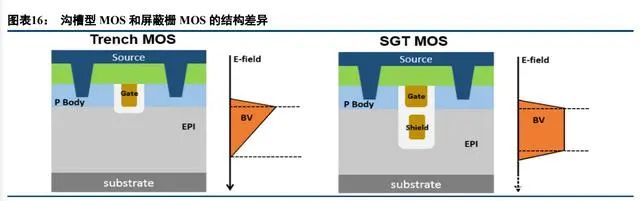 溝槽型 MOSFET,主要用于低壓(100V)領(lǐng)域;SGT(Shielded Gate Transistor,屏蔽柵溝槽)MOSFET,主要用于中 低壓(200V)領(lǐng)域;SJ-MOSFET,即超結(jié) MOSFET,主要在高壓(600V-800V)領(lǐng)域應(yīng)用。SGT MOSFET(Shield Gate Trench MOSFET)是一種新型的功率半導(dǎo)體器件,SGT 工藝比普通溝槽簡(jiǎn)單,開關(guān)損耗小。再加上 SGT 比普通溝槽工藝挖掘深度深 3-5 倍,可以橫向使用更多的外延體積來阻止電壓,這也使得 SGT 的內(nèi)阻比普通 MOSFET 低 2 倍以上,所以 SGT MOSFE 作為開關(guān)器件應(yīng)用于新能源電動(dòng)車、新型光伏發(fā)電、節(jié)能家電等領(lǐng)域 的電機(jī)驅(qū)動(dòng)系統(tǒng)、逆變器系統(tǒng)及電源管理系統(tǒng),是核心功率控制部件。
