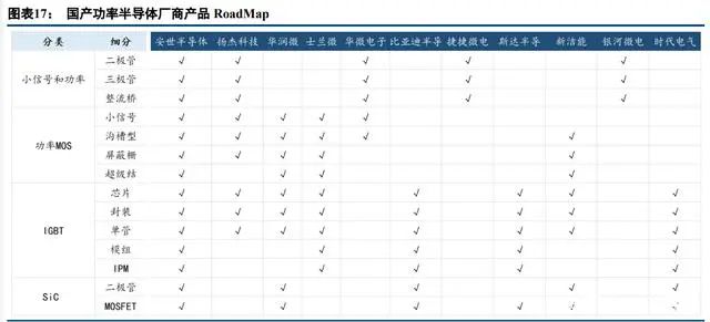 目前國(guó)內(nèi)功率半導(dǎo)體廠商眾多,產(chǎn)品線差異也比較大,營(yíng)收規(guī)模較大的廠商主力產(chǎn)品是 MOSFETs,隨著電 動(dòng)車和光伏、風(fēng)電等新能源發(fā)電領(lǐng)域?qū)τ?IGBT 的大幅需求增長(zhǎng),各個(gè)廠商開始逐步將產(chǎn)品線擴(kuò)展至 IGBT,部分龍頭廠商已經(jīng)開始布局第三代半導(dǎo)體 SiC 襯底的功率 MOSFET。根據(jù)我們的統(tǒng)計(jì),目前國(guó)內(nèi)在功率半導(dǎo)體產(chǎn)品布局最完善的廠商是聞泰科技旗下的安世半導(dǎo)體,首先公司 主力產(chǎn)品線覆蓋了晶體管(包括保護(hù)類器件 ESD/TVS 等)、Mosfet 功率管、模擬與邏輯 IC 三大領(lǐng)域,小型號(hào) MOSFET 居于全球排名第二,公司汽車類 POWER MOSFET 預(yù)計(jì)市場(chǎng)地位僅次于英飛凌。其次公司通過提高研 發(fā)投入進(jìn)一步加強(qiáng)了在中高壓 Mosfet、化合物半導(dǎo)體產(chǎn)品 SiC 和 GaN 產(chǎn)品布局,同時(shí)收購(gòu)英國(guó) Newport 晶圓廠 100%股權(quán),獲得了 4000 片/月的 IGBT 產(chǎn)能,目前公司漢堡工廠已經(jīng)開始搬入碳化硅設(shè)備,預(yù)計(jì) SiC MOSFET 新品在 2022 年量產(chǎn)。
