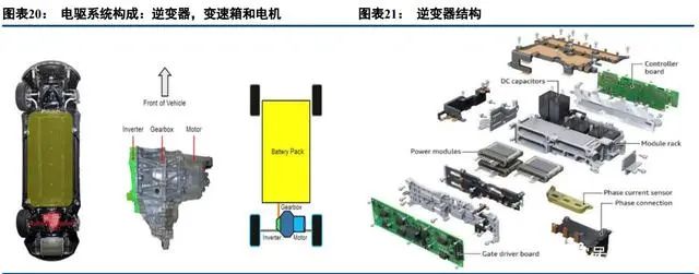 通常我們將交流轉(zhuǎn)換為直流稱為整流,反過來直流轉(zhuǎn)換為交流則稱為逆變,電動(dòng)車的逆變器承擔(dān)的核心職 能是將動(dòng)力電池輸出的直流電轉(zhuǎn)換為交流電供驅(qū)動(dòng)電機(jī)使用。純電動(dòng)汽車上的逆變器位于電機(jī)控制器(MCU 內(nèi)), 除了逆變器外,還有控制器一起組合在 MCU 內(nèi),MCU 是整個(gè)動(dòng)力系統(tǒng)的控制中心??刂破魇墙邮茯?qū)動(dòng)電機(jī)的 需求信號(hào),當(dāng)車輛制動(dòng)或者加速時(shí),控制器控制變頻器的頻率升降使汽車行駛。逆變器接受動(dòng)力電池輸出的直 流電能,逆變成三相交流電提供給電機(jī)運(yùn)轉(zhuǎn),在電動(dòng)汽車制動(dòng)過程中又起到制動(dòng)回收電能的作用。