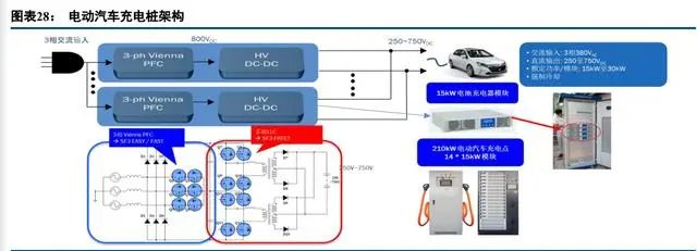 Vienna 整流+LLC 構(gòu)成了充電樁的基本電路。如果考慮設(shè)備成本,使用 Si 基 IGBT 和超級(jí)結(jié) MOSFET、 FRD(快恢復(fù)二極管)方案更具成本優(yōu)勢(shì);如果需要高功率密度和高效率,碳化硅 MOS/SBD 方案更具性能優(yōu) 勢(shì)。PFC 部分更適合使用碳化硅器件,理由有二:其一,高溫時(shí)導(dǎo)通電阻增加較少,能實(shí)現(xiàn)高效率,同時(shí)可抑 制發(fā)熱,使用更小的散熱板;其二,碳化硅器件的恢復(fù)損耗非常小,開關(guān)損耗較小,能夠提高工作頻率,有助 于輸入線圈的小型化。作為硅器件解決方案,Si 基的超級(jí)結(jié) MOS 和 IGBT 也是不錯(cuò)的替代方案。價(jià)值量方面, 慢充 20KW 以內(nèi)用半橋工業(yè) IGBT,單樁價(jià)值量在 200 元以內(nèi),如果采用超級(jí)快充 100KW 以上,超大功率的充 電樁會(huì)采用 SiC 方案,成本會(huì)成倍增加,整體價(jià)值量會(huì)提升至 1000 元以上。