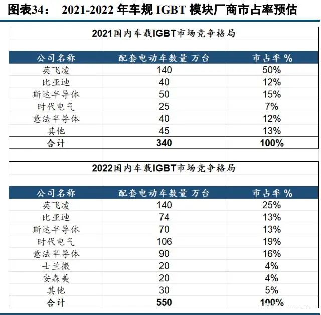 2021 年 10 月開始,全球汽車領(lǐng)域缺芯情況逐漸緩解,我們預(yù)計(jì) 2022 年國(guó)內(nèi)新能源汽車銷量有望超過 500 萬輛達(dá)到 550 萬輛,同比成長(zhǎng) 62%。通過我們的產(chǎn)業(yè)鏈跟蹤與調(diào)研,國(guó)內(nèi)廠商 IGBT 產(chǎn)線在 2021 年底相繼投入 量產(chǎn),預(yù)計(jì) 2022 年國(guó)內(nèi)車載 IGBT 芯片市場(chǎng)格局將發(fā)生較大的變化。首先是市占率提升最明顯的預(yù)計(jì)是中車時(shí) 代電氣,由于公司月產(chǎn)能 2 萬片的 8 寸線在 2021 年底已經(jīng)投產(chǎn),滿產(chǎn)能夠供應(yīng) 200 萬輛新能源汽車所需的 IGBT 模塊,拉平全年預(yù)估公司車載 IGBT 配套的汽車為 106 萬輛,市占率從 7%提升至 19%,其次是士蘭微由于 12 寸 IGBT 產(chǎn)線投產(chǎn),預(yù)計(jì)明年有望配套 20 萬輛左右電動(dòng)車,市占率達(dá)到 4%。美國(guó)安森美預(yù)計(jì)在 2022 年配套約 20 萬輛左右的電動(dòng)車,市占率預(yù)計(jì)為 4%。比亞迪和意法半導(dǎo)體的市占率預(yù)計(jì)將保持穩(wěn)定,斯達(dá)和英飛凌的占 比將出現(xiàn)下滑。