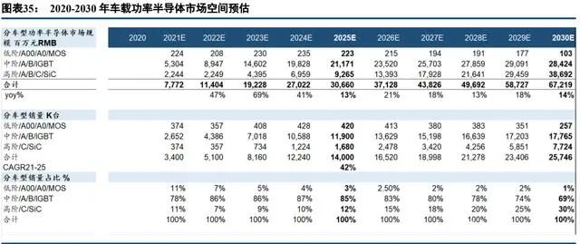 從投資功率半導(dǎo)體的角度,我們更看好的是 IGBT 領(lǐng)域的布局,一方面 MOSFET 的技術(shù)相對(duì)成熟,另一方面就是電車的增量功率需求也主要是 IGBT。2019 年到-2020年國(guó)內(nèi)新能源汽車銷售規(guī)模為 120-130 萬臺(tái),增速 相對(duì)平穩(wěn),2021年國(guó)內(nèi)新能源汽車銷量達(dá)到 340 萬臺(tái),按照單車功率半導(dǎo)體價(jià)值為 3000 元計(jì)算,對(duì)應(yīng)約 102 億左右的車載 IGBT 市場(chǎng)規(guī)模。預(yù)計(jì)到 2025年國(guó)內(nèi)新能源汽車銷售量將達(dá)到 1000 萬臺(tái)左右,對(duì)應(yīng)需求空間約 為 300 億左右(不考慮 SiC 對(duì)于 IGBT 的替代)。