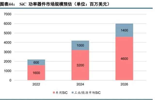 新能源汽車系統(tǒng)架構(gòu)中涉及到功率半導(dǎo)體應(yīng)用的組件包括:電機(jī)驅(qū)動(dòng)系統(tǒng)、車載充電系統(tǒng)(OBC)、電源轉(zhuǎn)換系統(tǒng)(車載 DC/DC)和非車載充電樁。碳化硅功率器件應(yīng)用于電機(jī)驅(qū)動(dòng)系統(tǒng)中的主逆變器,能夠顯著降低電 力電子系統(tǒng)的體積、重量和成本,提高功率密度。Wolfspeed 預(yù)計(jì) 2026 年車載 SiC 市場(chǎng)規(guī)模將從 2022 年的 16 億美元增加至 2026 年的 46 億美元。