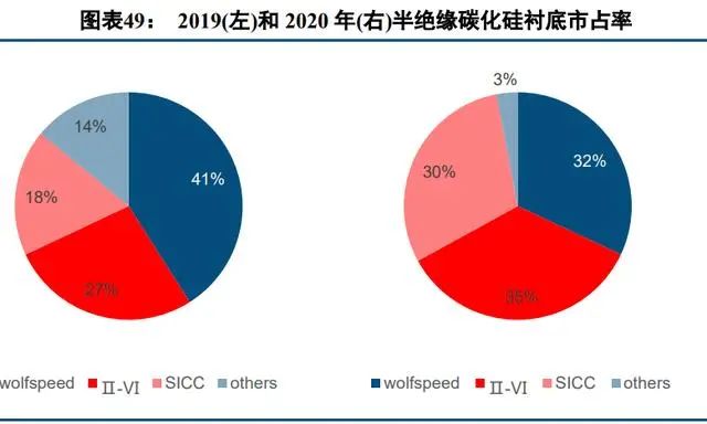 全球碳化硅襯底市場(chǎng)主要由美國(guó)和歐洲廠商控制,根據(jù) Yole 的統(tǒng)計(jì),2018 年導(dǎo)電型碳化硅襯底市場(chǎng)中 CREE 占比為 62%,美國(guó)半導(dǎo)體材料大廠Ⅱ-Ⅵ市占率為 16%,國(guó)內(nèi)廠商天科合達(dá)和山東天岳占比僅為 1.7%和 0.5%。半絕緣型襯底市場(chǎng)中 Wolf speed 市占率從 2019 年的 41%下滑至 32%,Ⅱ-Ⅵ半導(dǎo)體市占率從 2019 年的 27%上升 至 35%,兩大龍頭合計(jì)占據(jù)近 70%的市場(chǎng)。山東天岳以半絕緣型襯底產(chǎn)品為主,2020 年市占率達(dá)到 30%,根絕 公司招股書披露 2020 年公司半絕緣型襯底 3.47 億元營(yíng)收測(cè)算,全球半絕緣型碳化硅市場(chǎng)規(guī)模僅為 12 億元人民 幣。2020 年 Wolf-Speed 營(yíng)收為 4.71 億美元,剔除 0.59 億美元半絕緣型襯底的營(yíng)收,預(yù)計(jì)導(dǎo)電型碳化硅襯底營(yíng) 收規(guī)模約為 4.12 億美元,假設(shè) Wolfspeed 市占率在 2020 年接近 50%,合計(jì)導(dǎo)電型碳化硅襯底市場(chǎng)規(guī)模約為 8.24 億美元。綜合來看,2020 年全球碳化硅襯底市場(chǎng)約為 10 億美元,2021 年 Wolfspeed 營(yíng)收增長(zhǎng) 12%,預(yù)計(jì) 2021 年全球碳化硅襯底銷售規(guī)模增至 11.3 億美元。