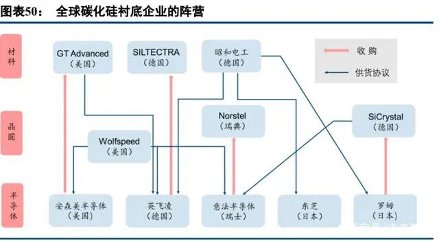 在功率半導(dǎo)體芯片市場(chǎng),尤其是 IGBT 芯片市場(chǎng)的競(jìng)爭(zhēng)已經(jīng)從芯片設(shè)計(jì)延伸至中游的制造和下游的模塊封 裝領(lǐng)域,然而進(jìn)入到碳化硅時(shí)代,我們認(rèn)為碳化硅功率半導(dǎo)體的競(jìng)爭(zhēng)已經(jīng)從芯片設(shè)計(jì)、中游制造和下游封裝進(jìn) 一步向產(chǎn)業(yè)鏈上游的襯底和外延環(huán)節(jié)擴(kuò)張。國(guó)際大廠很早就意識(shí)到了碳化硅之爭(zhēng)的關(guān)鍵就在對(duì)于襯底資源的控制權(quán),早在 2009年日本羅姆就通過收購(gòu)德國(guó) SiC 襯底和外延片供應(yīng)商 SiCrystal 實(shí)現(xiàn)了 SiC 器件研發(fā)的實(shí)質(zhì)性 突破。2018年英飛凌收購(gòu)了德國(guó)碳化硅晶圓切割領(lǐng)域的新銳公司 Siltectra,通過收購(gòu)獲得了一種稱為“冷分裂 (Cold Split)”的材料切割技術(shù),借助這種專有工藝可以高質(zhì)量低成本的加工晶圓和對(duì)晶圓進(jìn)行減薄,尤其是對(duì) 于碳化硅這種超高硬度材料的切割優(yōu)勢(shì)非常明顯。