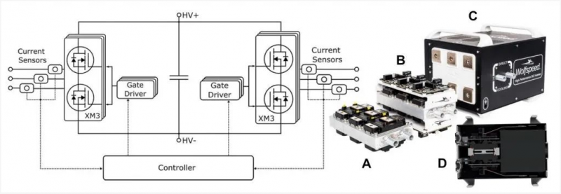 圖1. 系統(tǒng)方框圖(左)顯示有三個主要組件:兩個轉(zhuǎn)換器模塊(每個模塊均有一個柵極驅(qū)動器)以及控制器。雙逆變器外殼 (C) 的外部還顯示有安裝在冷板上以及帶有柵極驅(qū)動器的電源核心 (B) 上的電源模塊 (A)。提供手柄和底座,方便攜帶。D 顯示橫截面為 204 mm x 267.5 mm。
