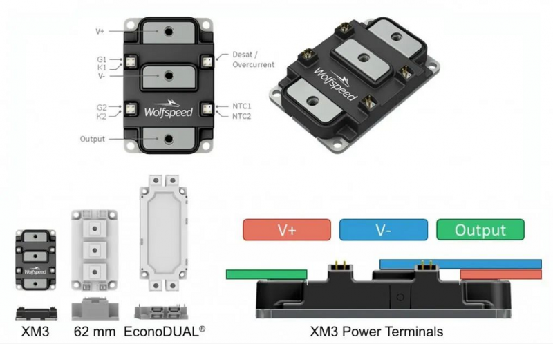基于 Wolfspeed XM3 全碳化硅(SiC)平臺的功率模塊具有出色的功率密度,顯然是不二之選。它的重量和體積大約是標(biāo)準(zhǔn) 62 mm 模塊的一半,與 EconoDUAL 相比,差距更加顯著(圖 2)。