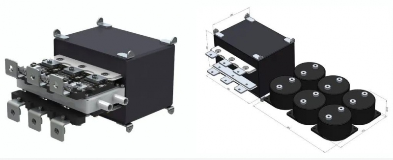 在電壓為 900 V 時,定制電容為 600 μF,峰值電壓額定值為 1200 V。為了降低快速開關(guān)碳化硅(SiC)逆變器高 di/dt 速率下的常見電壓尖峰,電容和集成母線雜散電感至關(guān)重要,在經(jīng)阻抗分析儀測量端子處的 13 nH 等效串聯(lián)電感后,該設(shè)計已得到驗(yàn)證。該電容結(jié)合 XM3 模塊的 6.7 nH 電感,總電源回路電感僅為 20 nH,能夠達(dá)到更快的開關(guān)速度。