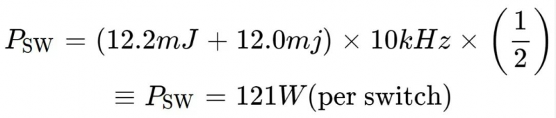 接著,根據(jù) 300 A 標(biāo)稱條件下已知的 12.2 mJ 開通能量和 12 mJ 關(guān)斷能量,計算每個模塊的開關(guān)損耗。使用開關(guān)功率損耗(PSW)公式,