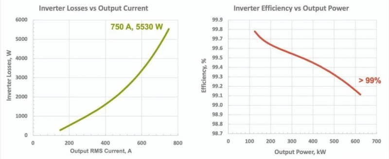 10 kHz、375 A 時的開關(guān)能量為 31 mJ。關(guān)于每個開關(guān) 5.53 kW 或 460 W 的總損耗,開關(guān)損耗為 1.8 kW。因此,最高達(dá) 624 kW 的逆變器效率超過 99%(圖 8)。