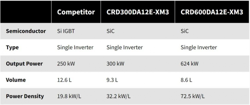 表 1. CRD600DA12E-XM3 實(shí)現(xiàn)了 72.5 kW/L 的功率密度,比等效額定 IGBT 設(shè)計的潛在值高 3.6 倍。