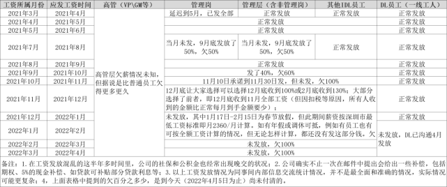 此前,柔宇科技前述員工李艷紅曾表示,2021年3月,當(dāng)時(shí)VP(Vice President,副總裁,記者注)級(jí)別高管已經(jīng)出現(xiàn)被拖欠薪資的情況。VP以下的管理崗當(dāng)年3月拖欠的薪酬到5月份發(fā)放,7月的工資到9月收到50%;8月的工資9月正常發(fā)放,9月工資10月只收到40%。此后,薪酬發(fā)放開始越來(lái)越混亂。