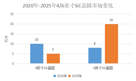 從現(xiàn)有的技術(shù)來(lái)看,碳化硅市場(chǎng)依舊是以6英寸為主,8英寸還沒有達(dá)到大規(guī)模量產(chǎn)階段。中國(guó)寬禁帶功率半導(dǎo)體及應(yīng)用產(chǎn)業(yè)聯(lián)盟數(shù)據(jù)顯示,到2025年,4英寸 SiC 晶圓市場(chǎng)將從2020年的10萬(wàn)片下降為5萬(wàn)片,而6英寸SiC 晶圓市場(chǎng)將從2020年的8萬(wàn)片增長(zhǎng)至20萬(wàn)片。