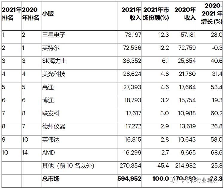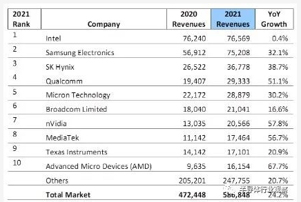 表 1. 2021 年全球按收入劃分的前10大半導(dǎo)體供應(yīng)商(百萬美元)