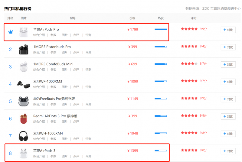 以中關村在線統(tǒng)計的品牌耳機類排行榜為例,airpods pro的銷量和熱度確實都要遠高于airpods 3,迄今仍居于榜首,而才發(fā)布不久的airpods 3卻已經掉到了榜單第八的位置,排在其前面的品牌包括:萬魔、索尼、華為以及Redmi。