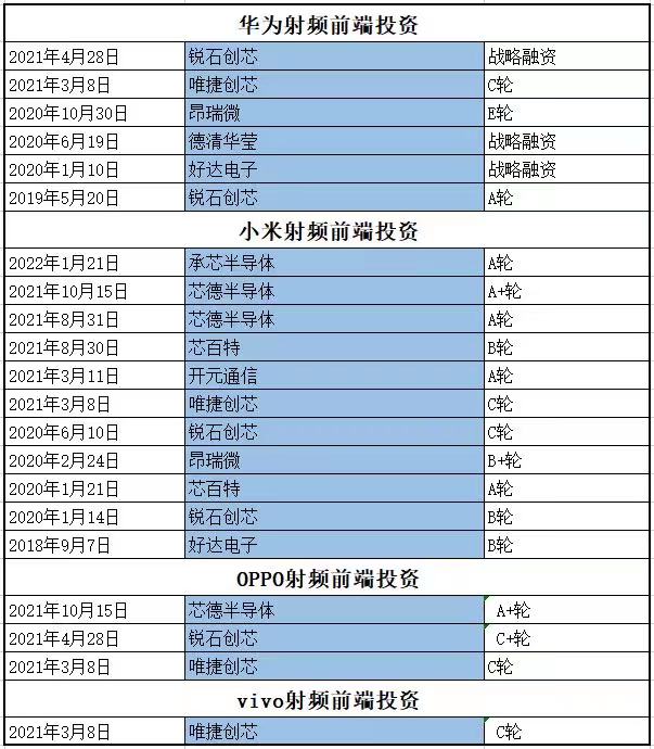 華為、小米、OPPO、VIVO在射頻前端投資匯總